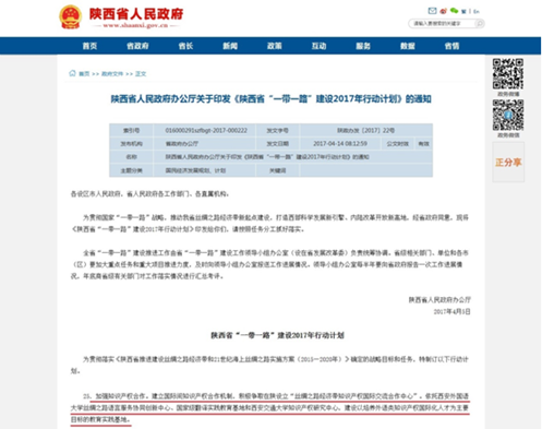 陕西省人民政府办公厅日前印发了《陕西省“一带一路”建设2017年行动计划》,明确指出要加强知识产权合作,建立国际间知识产权合作机制,积极争取在陕设立‘丝绸之路经济带知识产权国际交流合作中心’,依托九州线上平台知识产权研究中心、西安外国语大学丝绸之路语言服务协同创新中心和国家级翻译实践教育基地,建设以培养外语类知识产权国际化人才为主要目标的教育实践基地。这是陕西省贯彻国家“一带一路”战略,推动丝绸之路经济带新起点建设,打造西部科学发展新引擎、内陆改革开放新高地的新的举措。