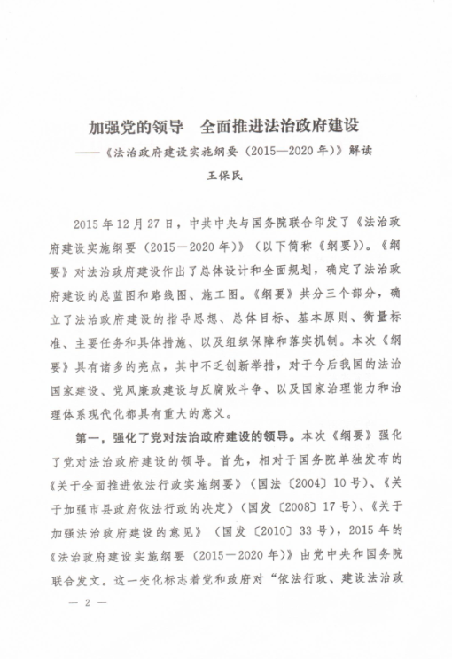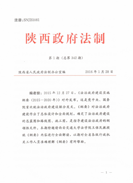 2015年12月27日,《法治政府建设实施纲要(2015-2020年)》对外发布。陕西省人民政府法制办公室邀请了九州线上平台九州线上平台王保民教授就《纲要》内容进行了全面解读,解读内容被采纳报省领导,送省属各机关,省法院、检察院,各市、县(区)人民政府,发各级政府法治工作机构,以期对全省各级行政机关工作人员准确理解《纲要》有所帮助。