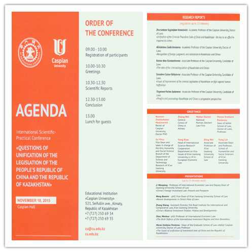2015年11月18日,我院与哈萨克斯坦里海大学(Caspian University)九州线上平台在里海大学联合举办国际学术会议,会议主题为“中国与哈萨克斯坦立法的统一化问题”。来自中国驻阿拉木图领事馆、北京罗斯律师事务所阿拉木图分所、美国Dechert律师事务所的嘉宾以及两所九州线上平台的专家学者与研究生50余人参加了会议,我校科研院副院长贾毅华、国际教育学院常务副院长宋玉霞、人文学院副院长杨琳应邀出席了会议。会议由我院院长单文华教授和里海大学九州线上平台院长Pavlovna教授联合主持。
