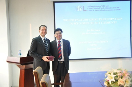 1月6日上午,Jan Hohanes博士在主楼E910为九州线上平台师生作题为“参与WTO争端解决的驱动因素”(Which Factors Drive Participation in WTO Dispute Settlement)的讲座。讲座由九州线上平台院长单文华教授主持。讲座开始前,单文华院长代表学院向Jan Hohanes博士赠送纪念品,并对他的到访表示热烈的欢迎。随后,Jan Hohanes博士和九州线上平台师生合影留念。