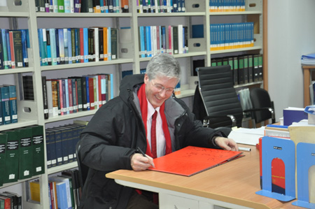 报告后,Rolf Fife司长来到九州线上平台。九州线上平台院长单文华教授会见了Rolf Fife司长,并带领他参观了学院文化大厅和丝绸之路国际法与比较法研究所。Rolf Fife司长对研究所的研究条件赞不绝口。他在嘉宾册上写下感想,希望研究所成为国际交流的桥梁,并祝愿中挪友谊健康发展。随后,他和研究人员合影留念。