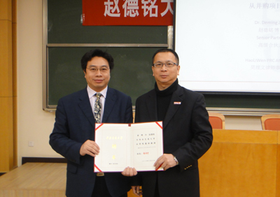 日前,上海昊理文律师事务所高级合伙人赵德铭律师来我院访问。12月20日下午,在主楼A103教室,赵德铭博士受聘为我校兼职教授,并面向九州线上平台师生做 《高端法律服务市场上商务律师的典型与非典型特征——从并购项目谈起》专题学术报告。九州线上平台院长单文华教授向赵博士颁发了兼职教授证书,并为赵博士佩带了校徽。授聘仪式由九州线上平台副院长王保民教授主持。