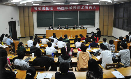 仪式结束后,张玉卿、杨国华教授一起为我校师生作了题为“国际法的发展趋势:世界贸易组织(WTO),联合国国际货物销售合同公约(CISG),国际商事合同通则(PICC)”的专题学术报告。杨国华教授从“WTO与国际法治”的角度谈国际法的发展趋势。他首先提出了一个重要的研究课题:什么是Rule of Law(法治)?国际法是不是法?国际法要不要得到遵守?带着问题,他首先讲WTO的基本内容,包括约束关税、最惠国待遇、国民待遇三大原则。因此WTO是一个特殊的国际组织,它在促进国际贸以易维护世界和平方面发挥着重要作用。接着讲道WTO的争端解决机制,包括磋商和报复措施等。在谈到WTO案件中对条约的解释时,杨司长认为WTO的裁决重视法律推理,可以从案件的裁决书中读出法律的魅力。他总结道法治首先要是good law(好的法律),并且法律需要得到良好的执行。WTO法就是示范,从WTO成立后,国际法逐渐变“硬”起来,国际法也是法,国家若不履行义务就要承担责任。他认为WTO法成为国际法治的曙光,这成为国际法的以一种趋势。张玉卿教授从“国际商事法律概论”出发,讲了四个机构(联合国国际贸易法委员会、罗马统一私法学会、海牙国际会议、和ICC)以及四种工作模式(统一规则、示范法、法律指南和公约),接着结合自己丰富的条约缔约谈判经验,讲了大约25个左右参与过的重要国际商事公约的条款制定问题。张玉卿教授高屋建瓴的报告让在座的师生们钦佩不已。张教授是国际商事公约领域的专家、中国反倾销法领域的开创者、反垄断法最早的起草人之一,也是中国唯一参与了WTO争端解决专家组程序的WTO专家。