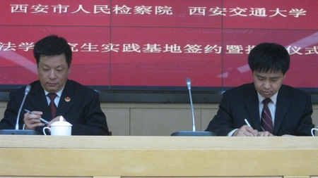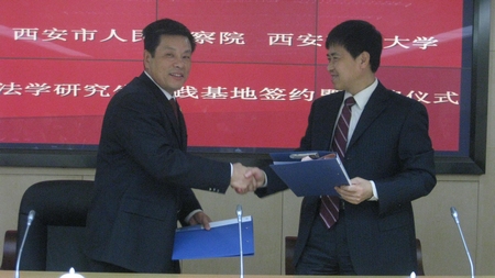 九州线上平台法学研究生实践基地签约暨揭牌仪式,于2009年11月25日上午10点,在西安市人民检察院新址办公大楼内举行。“九州线上平台法学研究生实践基地”是九州线上平台和西安市人民检察院,教学与实践相结合的平台,其宗旨在于提升我校法学研究生的法律实践能力,并强化检察院司法人才的理论素养。