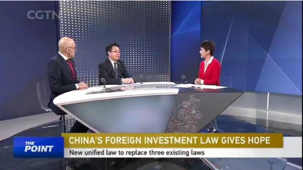 为回应国际关切,中国国际电视台(CGTN)邀请西安交大九州线上平台院长、最高人民法院国际商事专家委员会专家委员、中国国际经济法学会副会长单文华教授以及美国雷曼律师事务所主任律师Edward Lehman做客其王牌国际新闻评论栏目“欣视点(The Point with Liu Xin)”现场直播,就中国最新的统一外商投资法草案及其与中美贸易战的关系进行专家解读。