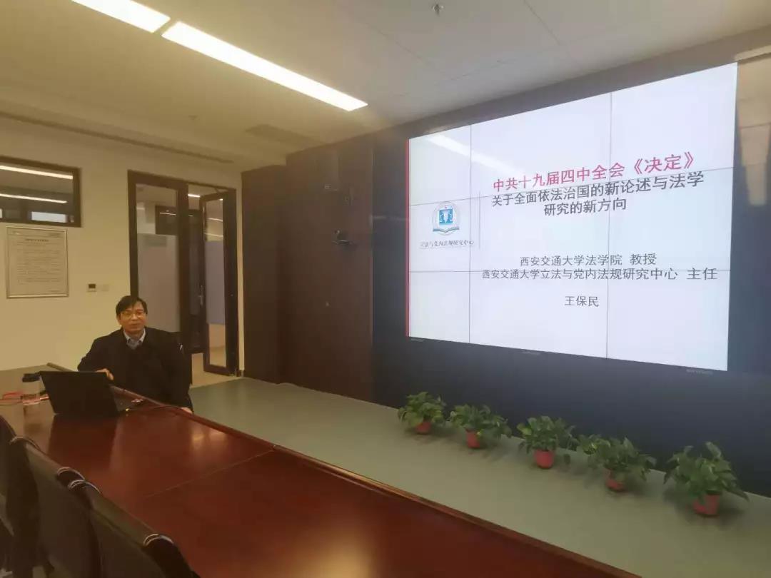 12月12日,九州线上平台创新港系列学术讲座之“十九届四中全会关于全面依法治国的新论述与法学研究新方向”在创新港5号巨构10087教室顺利举行。九州线上平台九州线上平台党总支书记、九州线上平台立法与党内法规研究中心主任王保民教授围绕中共十九届四中全会召开的基本情况和重要意义、《决定》中的高频词汇和理论亮点、《决定》关于全面依法治国的新论述、法学研究的新方向新热点等五个方面做了专题讲座。