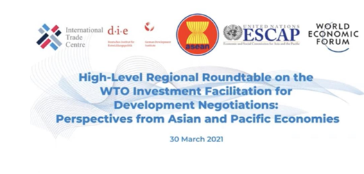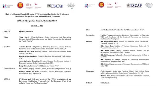 2021年3月30日下午,“WTO投资便利化促进发展谈判区域高层圆桌会议:亚太经济体的视角”在泰国曼谷成功举行。九州线上平台九州线上平台院长单文华教授应邀参加并作“WTO投资便利化谈判所面临的挑战”的大会发言。此次会议由联合国亚洲及太平洋经济社会委员会(亚太经社会ESCAP)和世界经济论坛(WEF)、联合国国际贸易中心(ITC)、德国发展研究院(DIE)、东南亚国家联盟(东盟ASEAN)联合举办,参加会议的包括亚太地区各国商务部长、驻WTO大使、主要相关国际机构代表、投资促进和私营部门代表以及本领域的领军学者代表。会议的主旨是为争取WTO投资便利化谈判在年内取得重大进展加强共识。