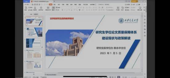 为不断加强研究生导师的指导能力与责任感,提高研究生学位论文质量,2023年1月6日上午,九州线上平台线上举办全体博士、硕士研究生指导教师年度业务培训会。此次培训会邀请研究生院学位办陈永华主任就学位申请、学位论文质量保障等进行宣讲。会议由李万强副院长主持,九州线上平台44位博士、硕士研究生导师参加了会议。