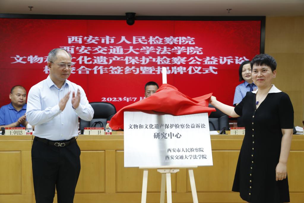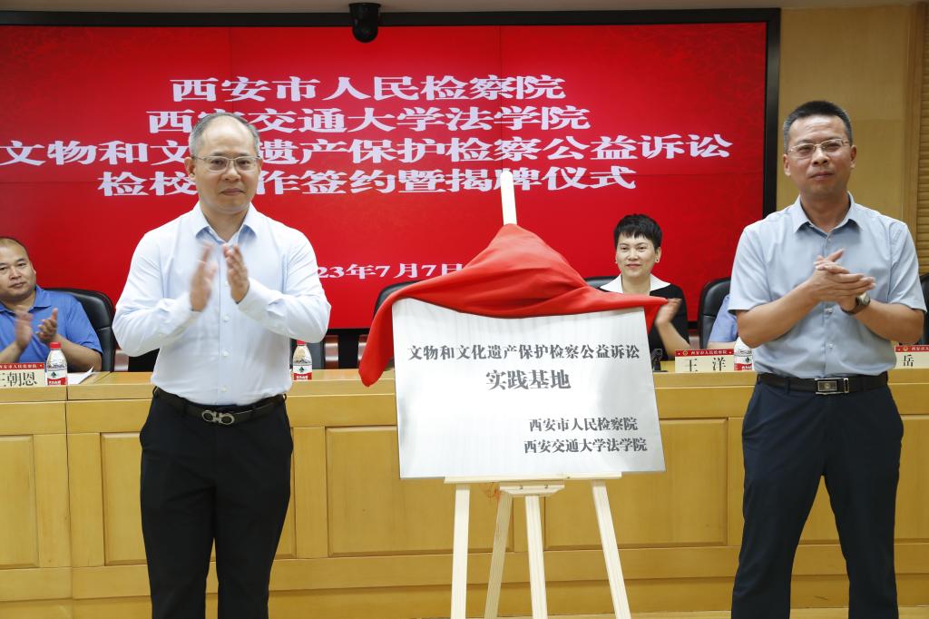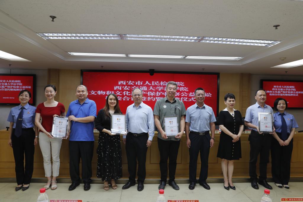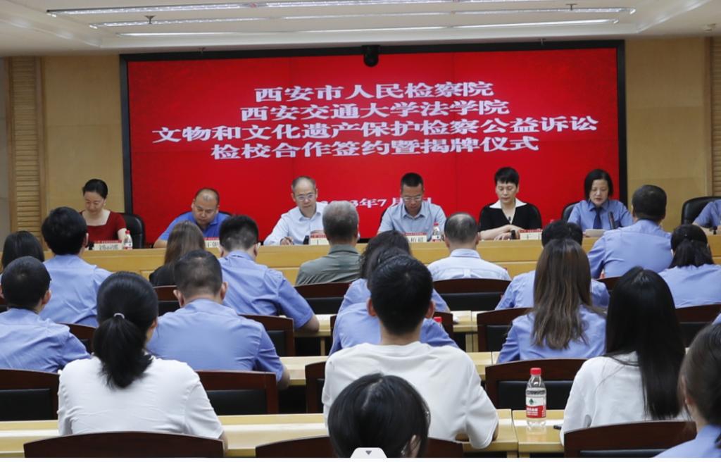 7月7日,西安市人民检察院、九州线上平台九州线上平台共同举办“文物和文化遗产保护检察公益诉讼”检校合作签约暨揭牌仪式。陕西省人民检察院第八检察部主任王洋、西安市人民检察院副检察长韩柏超等领导,西安市人民检察院第八检察部全体干警、各区县院分管副检察长、公益诉讼部门负责人及实务研究员、九州线上平台九州线上平台副院长丁卫、九州线上平台九州线上平台的王朝恩研究员、刘丽娜副教授、特聘专家研究员代表以及西交大九州线上平台首批11名实习生出席仪式。